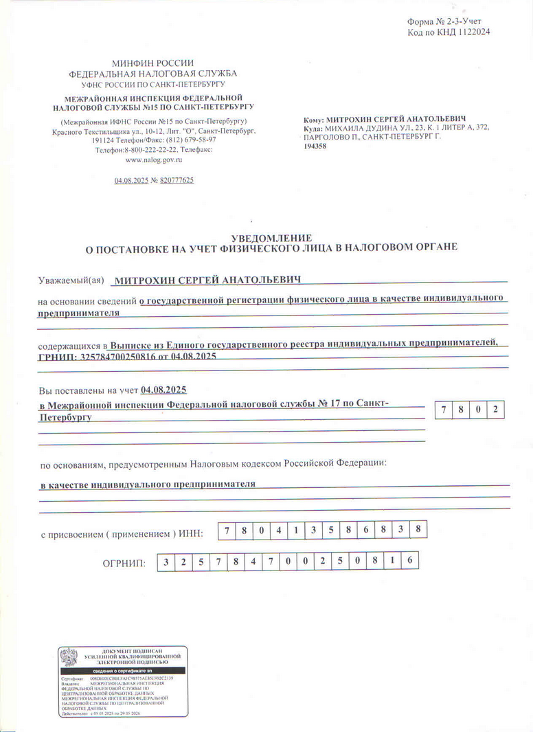 Наименование юр. лица: Индивидуальный предприниматель Митрохин Сергей Анатольевич